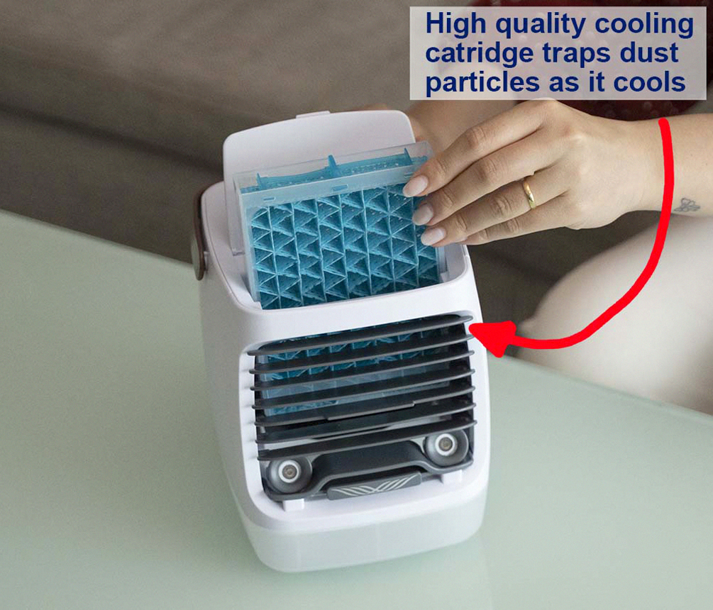The ChillWell 2.0 Portable Air Chiller has a Cooling Cartidge that can help trap all these particles before they get blown on you.
