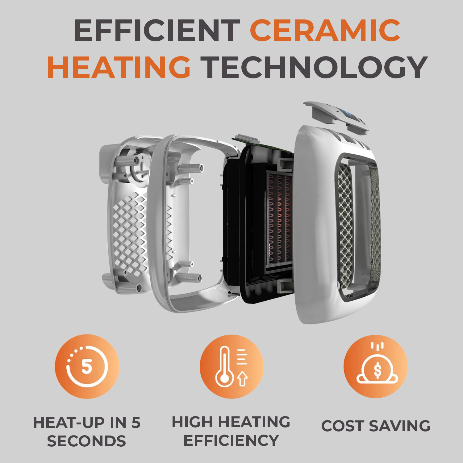 HeatWell is a PTC ceramic heater. This means it uses special heating discs to produce enough heat to quickly warm up small spaces. What’s great about PTC heaters like HeatWell is that as the heat increases, the power consumption drops – and, most importantly, you and your family stay warm.