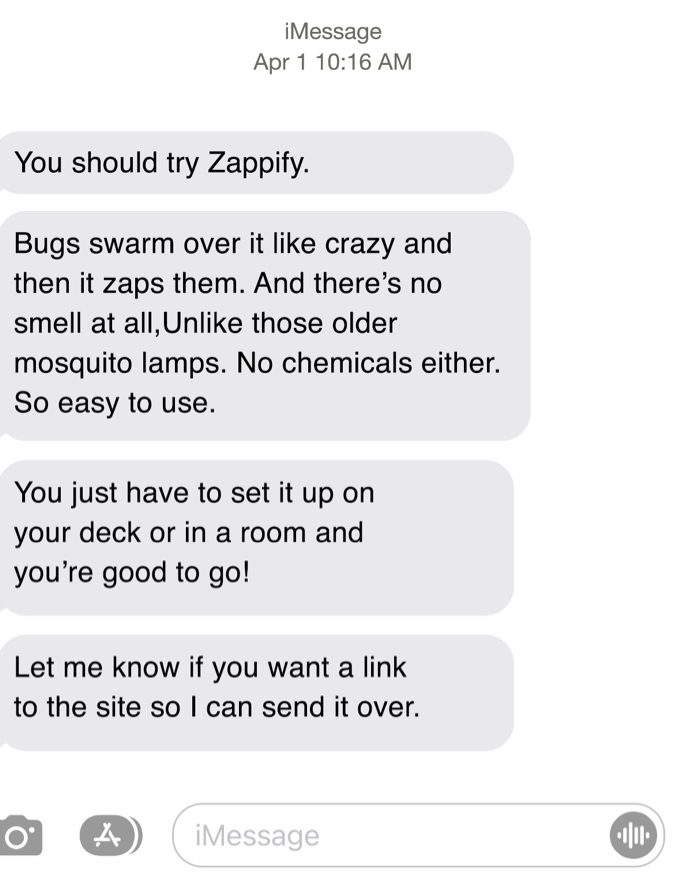 All we could hear was a quiet “zap” “zap” every time a mosquito would hitthe zapper.
